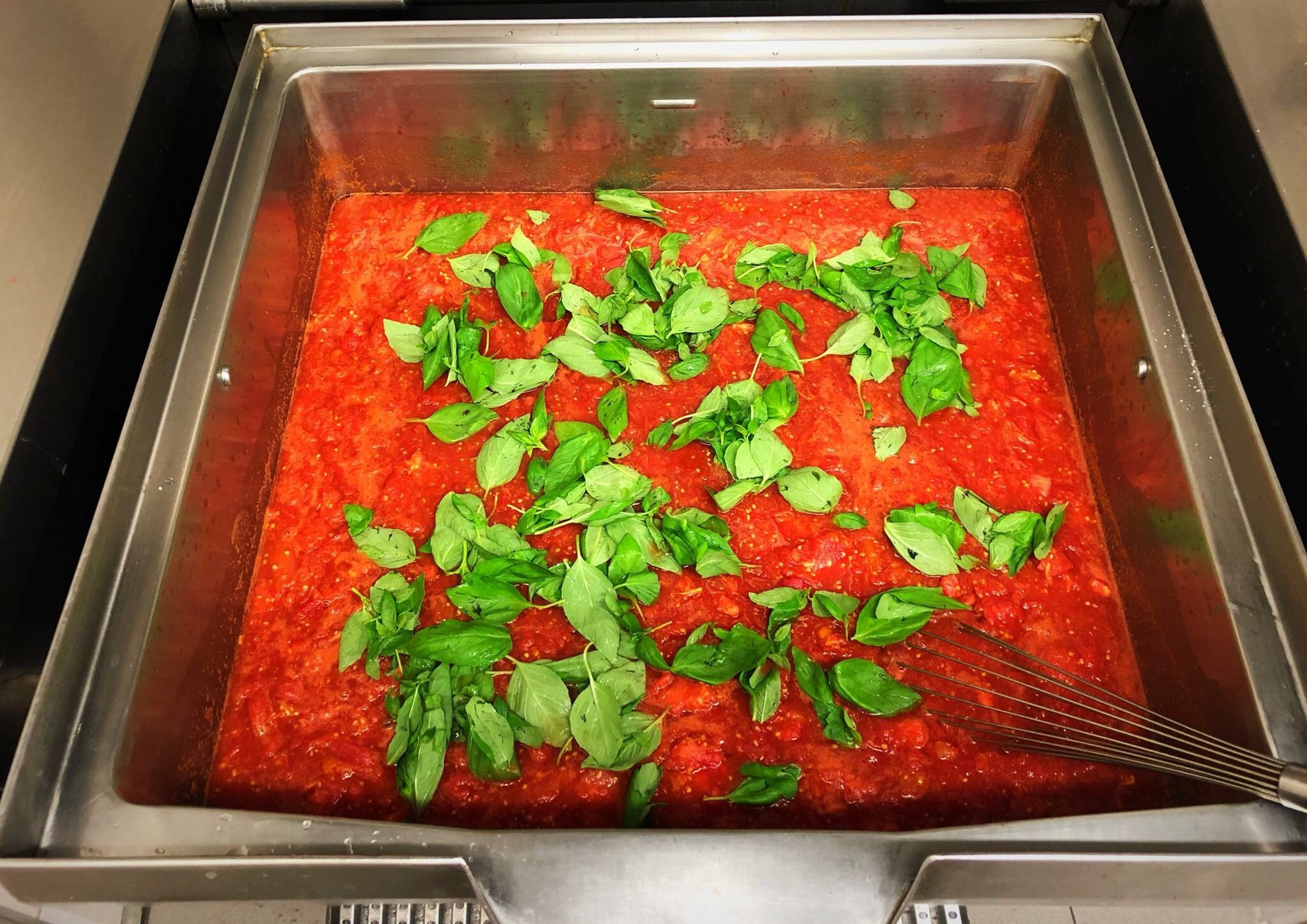 Préparation de la sauce Sicilien Enervé à base de tomates fraîches.